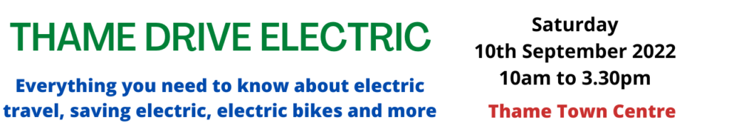 Come along to the Thame Drive Electric event on Saturday 10th September, 10am – 3.30pm, in the Upper High Street car park, opposite Rumsey’s. Organised by Thame Green Living and supported by 21st Century Thame and Thame Town Council, this is the second EV awareness event to be held in the town, and is specifically geared towards residents of Thame and surrounding villages.